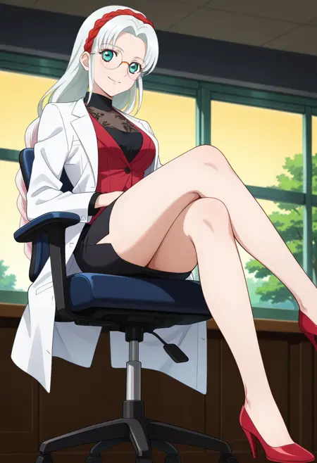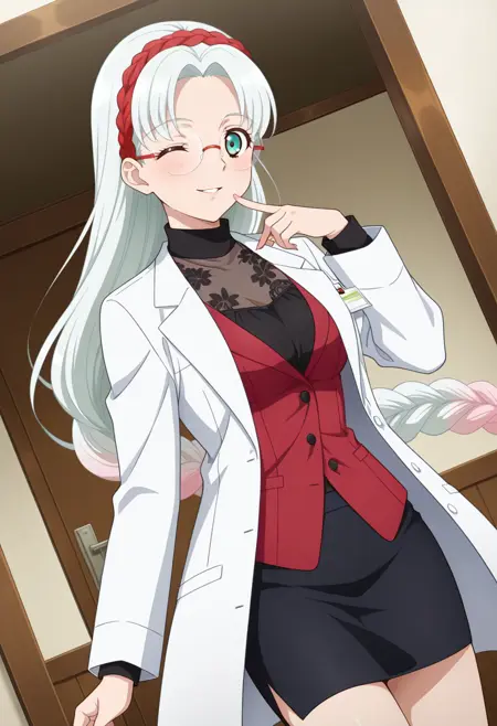 lailahgk, labcoat, red vest, black shirt, pencil skirt, black skirt,