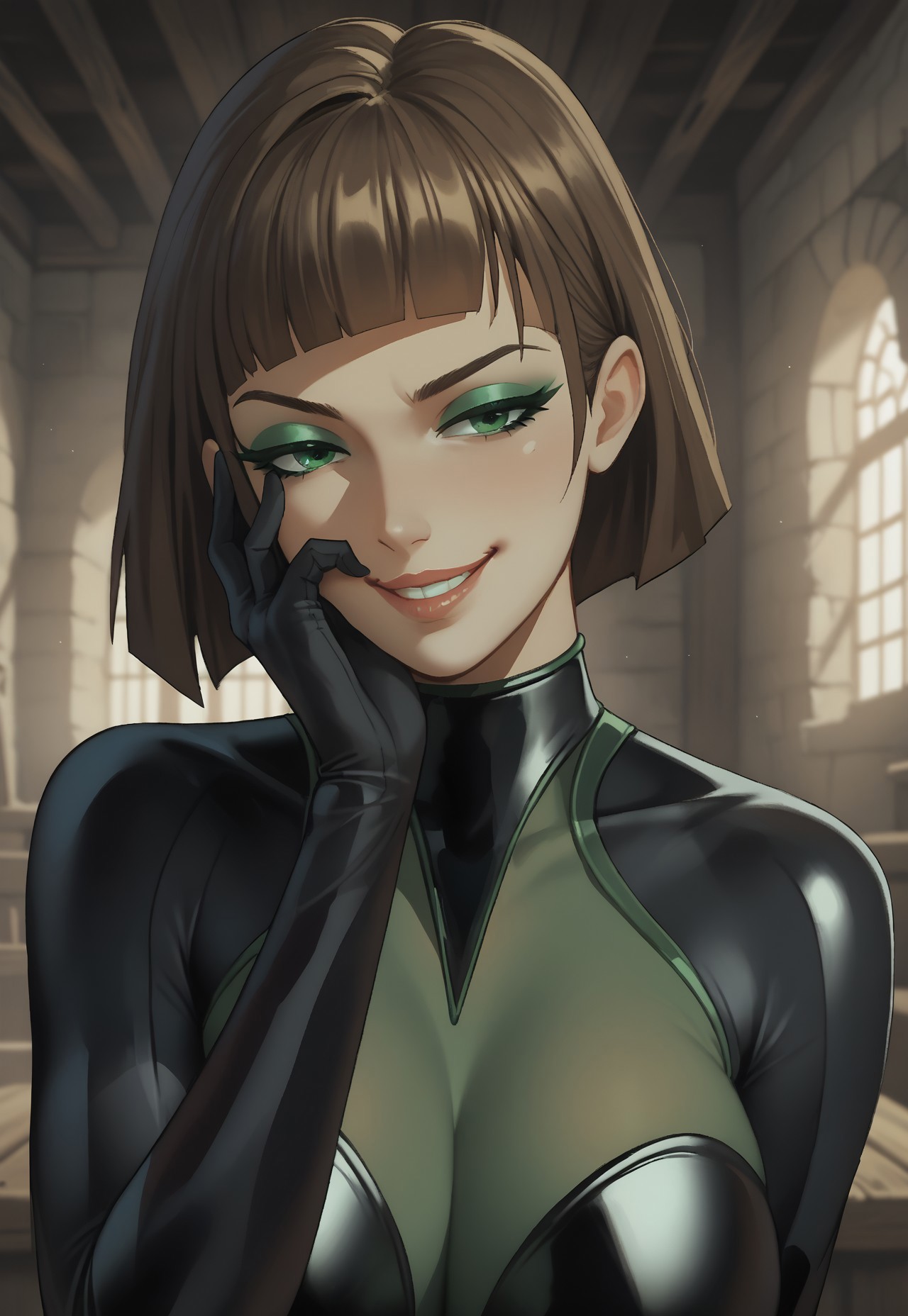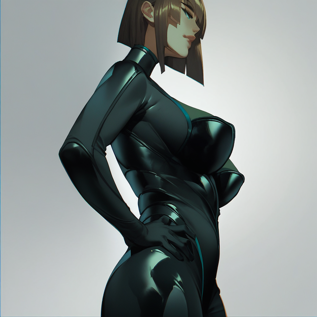 <Lora:Lady_Butterfly_Pony:0.9> TOTLadyBTF, bodysuit, himecut, brown hair, green eyes, green eyeshadow, latex,