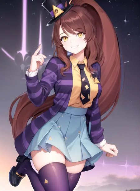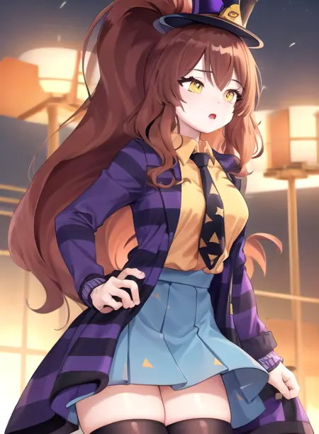 MettaCipher, solo, long hair, breasts, bangs, skirt, brown hair, shirt, thighhighs, long sleeves, hat, jacket, yellow eyes, ponytail, open clothes, necktie, striped, collared shirt, blue skirt, zettai ryouiki, high ponytail, mini hat, top hat, purple jacket,