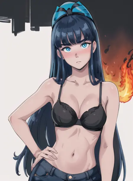 atenea, dlh, long hair, colored skin, blue hair, bangs, blue skin, blue eyes, black bra, pants