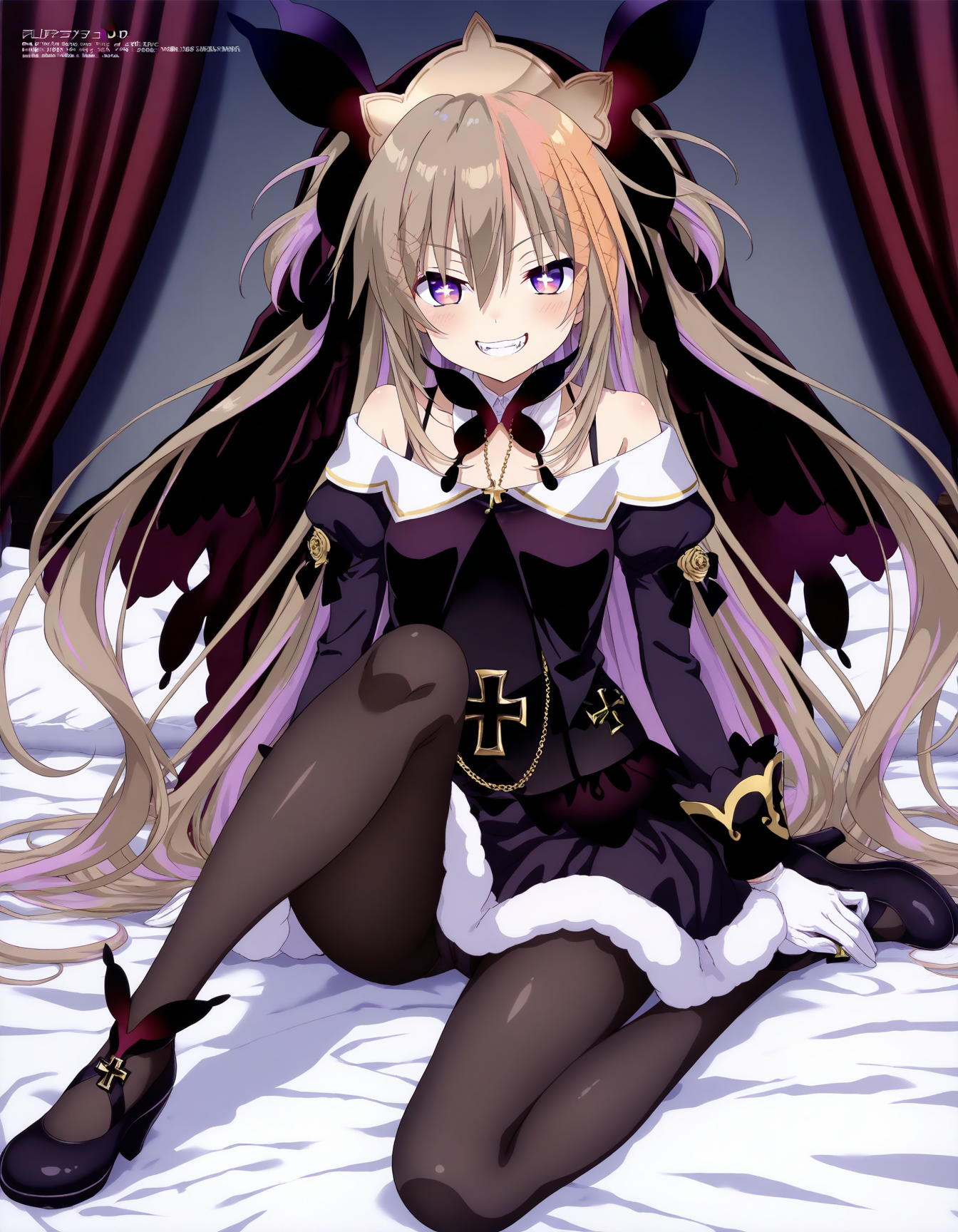 | トレーニングワード | <lora:Hijirime_reria:1>,Hijirime_reria, virtual youtuber, brown hair, blonde hair, long hair, very long hair, fangs, twintails, multicolored hair, purple eyes, hair ribbon, two side up, bangs, hair between eyes, hair ornament, eyes visible through hair,コピーしました! gloves, pantyhose, white gloves, dress, long sleeves, symbol-shaped pupils, fur trim, cross, black dress, skirt, black footwear, ribbon, heart, heart-shaped pupils, bare shoulders, black pantyhose, shoes, high heels, +_+, veil,コピーしました! |