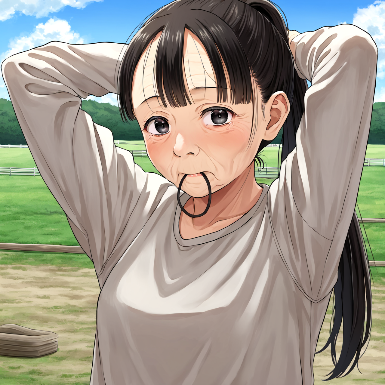 Clip or secure a hair tie, hairband, or scrunchie between your teeth or lips. However, in the real world, if you place a hair tie in your mouth, there is a risk of accidentally swallowing it or experiencing suffocation. In illustrations and fiction, this is often depicted when a hair tie needs to be temporarily removed or adjusted during activities such as styling one's hair, exercising, or tying one's hair.