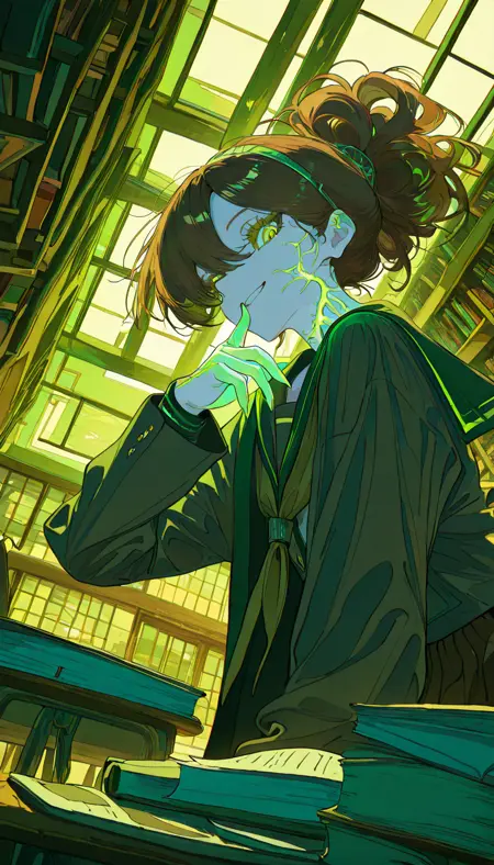 • 白皙皮肤,有色皮肤,苍白皮肤,高马尾,松散发丝,头发掖在发带下,棕色头发,绿色眼睛,苍白皮肤,扎起的头发,护士发带,白色发带,灰色上衣,扣子衬衫,卷起的袖子,绷带手臂,脏污围裙,绿色围裙,紧身深色长裤,战术裤,灰色长裤,黑色皮靴,厚重靴子,