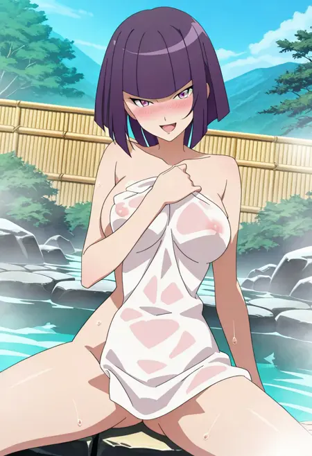 PKMNMatori,1girl, short hair, bob cut, blunt bangs, bangs, purple hair, purple eyes, eyelashes,