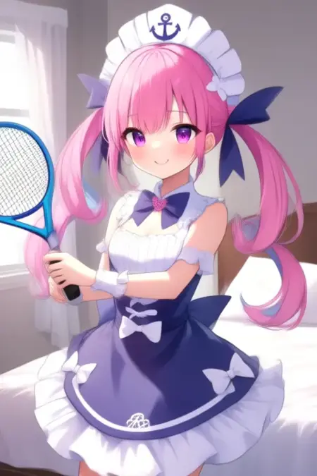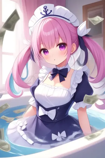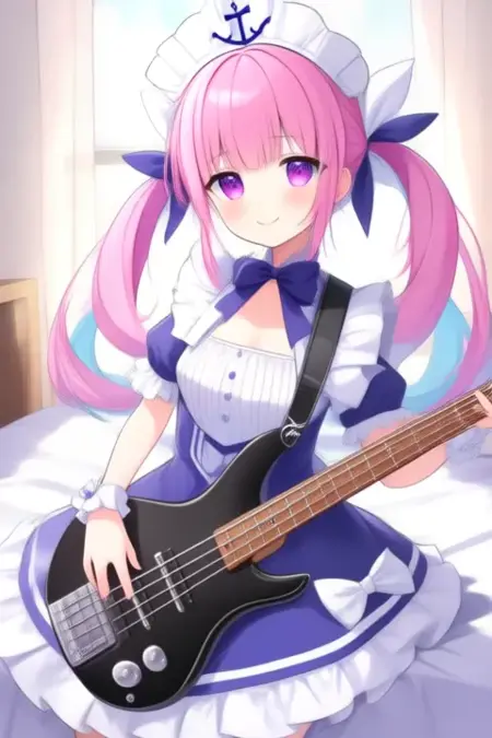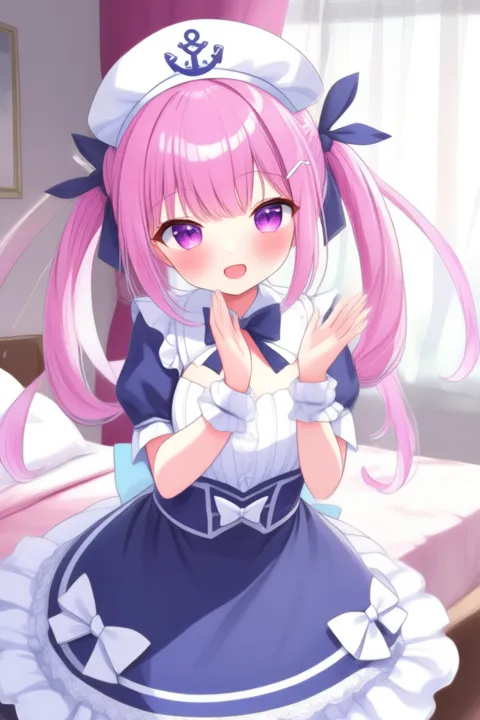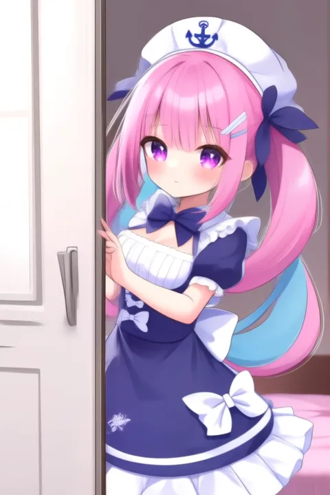 트리거 단어: 미나토 아쿠아, 애니메이션 스타일의 소녀. 이미지는 분홍색 머리카락을 트윈테일로 스타일링한 애니메이션 스타일의 캐릭터를 보여줍니다. 머리카락은 흰색 리본과 앞쪽에 작은 활로 장식되어 있습니다. 캐릭터는 보라색 눈을 가지고 있으며, 파란색과 흰색으로 구성된 해군 스타일 드레스를 입고 있습니다. 드레스는 흰색 칼라, 활이 달린 파란색 상의, 흰색 테두리와 활이 있는 파란색 스커트로 이루어져 있습니다. 드레스에는 여러 개의 활이 있으며, 머리 위에는 닻 문양이 있는 해군 모자를 썼습니다.