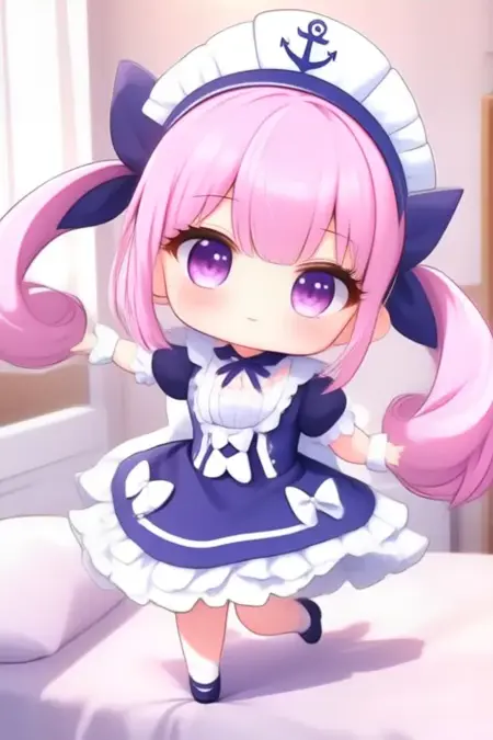 샘플 프롬프트: 미나토 아쿠아, 애니메이션 스타일의 소녀. 이미지는 분홍색 머리카락을 트윈테일로 스타일링한 애니메이션 스타일의 캐릭터를 보여줍니다. 머리카락은 흰색 리본과 앞쪽에 작은 활로 장식되어 있습니다. 캐릭터는 보라색 눈을 가지고 있으며, 파란색과 흰색으로 구성된 해군 스타일 드레스를 입고 있습니다. 드레스는 흰색 칼라, 활이 달린 파란색 상의, 흰색 테두리와 활이 있는 파란색 스커트로 이루어져 있습니다. 드레스에는 여러 개의 활이 있으며, 머리 위에는 닻 문양이 있는 해군 모자를 썼습니다. (그녀는 춤추고 있음:2.5), (치비 넌도로이드:3.5) 침실에서.