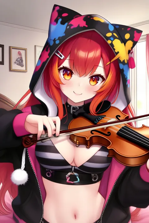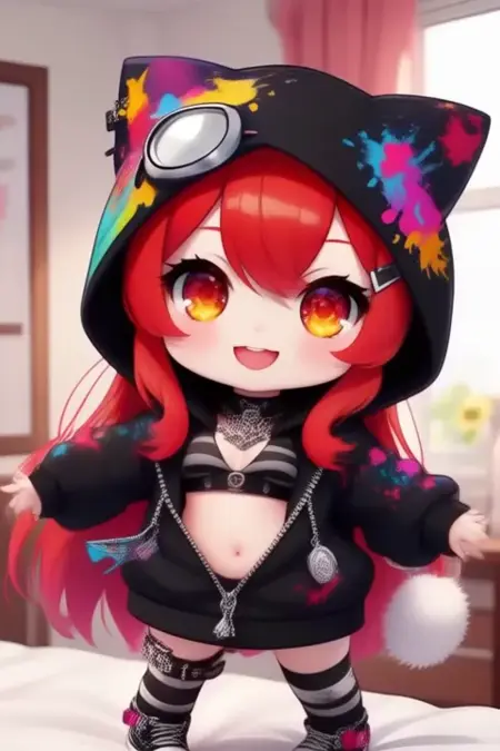 示例提示词:Nekota Tsuna,动漫风格女孩。图中为一位动漫风格角色,拥有浓烈的红色卷发,发丝松散波浪。角色拥有醒目的橙色双眼,在肤色衬托下格外突出。身着黑色连帽衫,帽檐带有彩色泼溅图案,包含蓝、黄、红等多种色调。搭配一条黑色项圈,增添酷感。角色头顶佩戴一副护目镜。上衣为黑白条纹高领款,略微露出腹部。连帽衫前襟有拉链,并装饰多种配件,包括一条带链条的项圈,以及一条悬垂的白色蓬松小饰物。(她正在跳舞:2.5),(Q版Nendoroid:3.5)在卧室中。