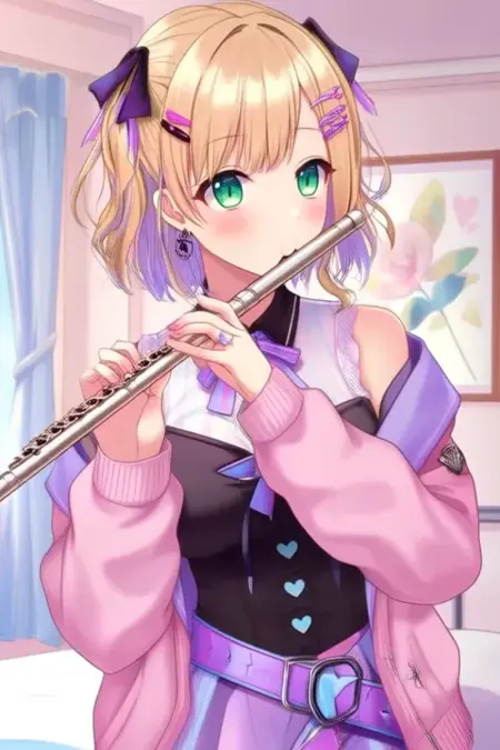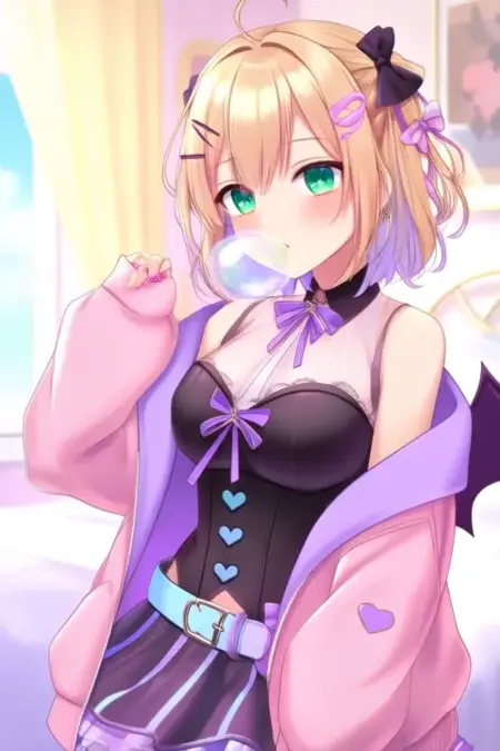 샘플 프롬프트: Kurumi Noah, anime-style girl. The image features an anime-style character with light blonde hair styled in loose curls. The hair is adorned with two purple bows on either side of the head. The character has green eyes and is wearing a pink hoodie with a black and white striped skirt underneath. The hoodie has a heart-shaped emblem on the chest and a small bow tie around the neck. The character's outfit also includes a black corset with blue heart-shaped buttons and a purple belt with a heart-shaped buckle (she is dancing:2.5), (chibi Nendoroid:3.5) in bedroom.