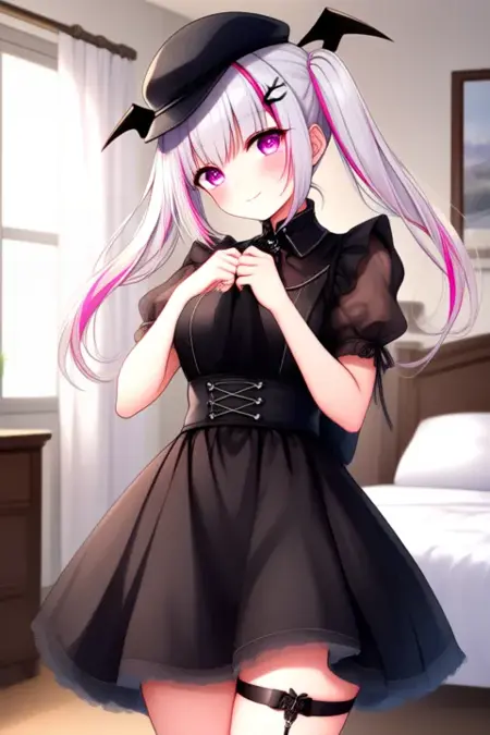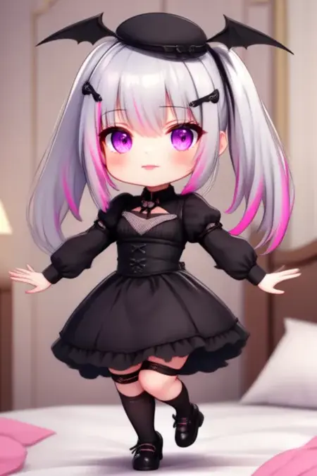 샘플 프롬프트: Asumi Sena, anime-style girl. The image features an anime-style character with long, white hair that is styled in twin tails. The hair has pink streaks on the sides. The character has large, expressive purple eyes.The character is wearing a black dress with a high collar and puffed sleeves. The dress has a corset-like bodice with a bow at the front and a belt cinching the waist. The skirt is short and pleated, with a small bow at the hem. The character also wears thigh-high stockings with black garters and a black hat with bat wings attached to it. (she is dancing:2.5), (chibi Nendoroid:3.5) in bedroom.