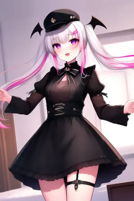 트리거 단어: Asumi Sena, 애니메이션 스타일 소녀. 이미지는 긴 흰색 머리카락을 트윈테일로 스타일링한 애니메이션 스타일 캐릭터를 특징으로 합니다. 머리카락 양쪽에 분홍색 스트라이프가 있습니다. 캐릭터는 크고 표현력 풍부한 보라색 눈을 가지고 있습니다. 캐릭터는 높은 칼라와 풀어진 소매가 있는 검은 드레스를 입고 있습니다. 드레스는 전면에 리본과 허리를 조이는 벨트가 있는 코르셋 같은 상의를 가지고 있습니다. 치마는 짧고 주름이 잡히며 밑단에 작은 리본이 있습니다. 캐릭터는 허벅지까지 오는 스타킹에 검은 골프를 착용하고 있으며, 박쥐 날개가 달린 검은 모자를 쓰고 있습니다.