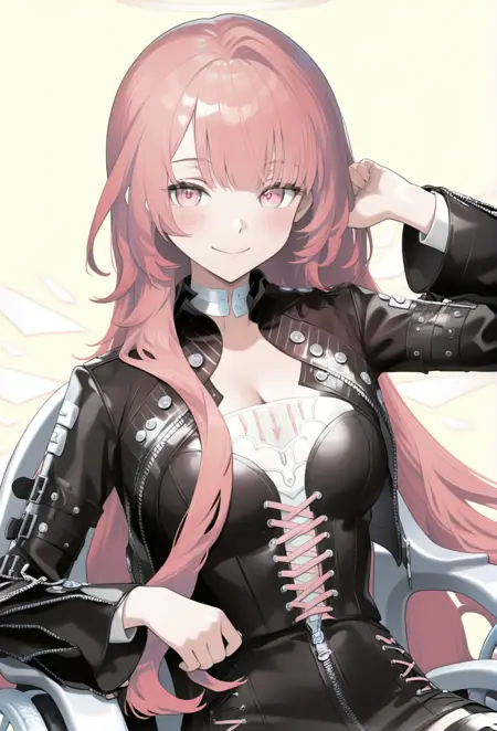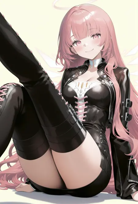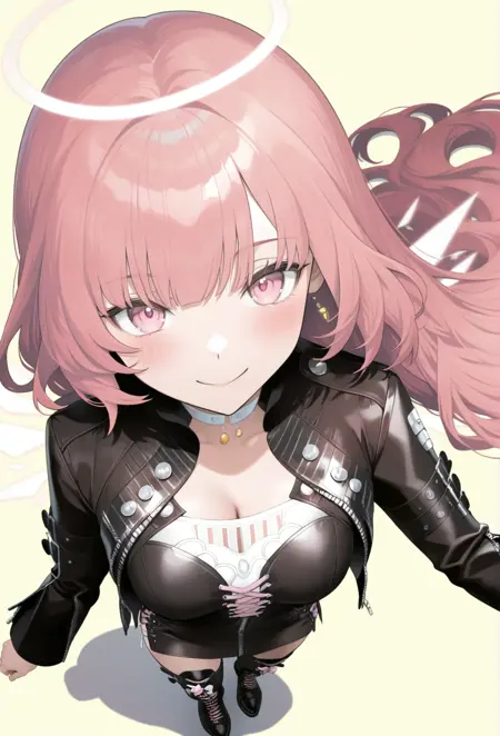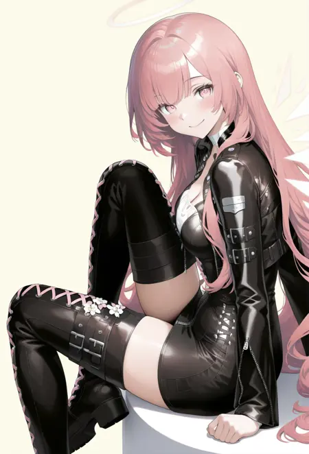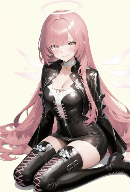 <lora:LemuenV1-Nuclear1811-IL>,halo,Lemuen,pink eyes,pink hair,long hair,very long hair,bangs,energy wings,detached wings,df,df jewelry,df choker,df cleavage,df jacket,df black jacket,df leather,df leather jacket,df cross-laced clothes,df long sleeves,df ring,df dress,df zipper,df boots,df black footwear,df cross-laced footwear,df thigh boots,df lace-up boots,lace-up boots,