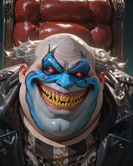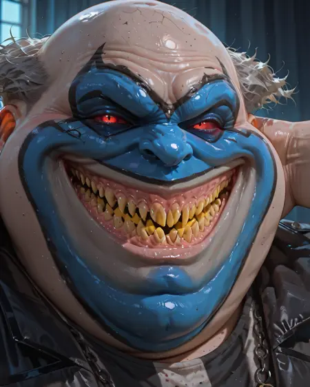 blue and light blue print on the face with black trim, gray skin, pale skin, low and fat, short clown,casually painted face, bald spot on head, grey hair on sides, blue face paint, red eyes, yellow teeth, sharp teeth,jagged teeth,