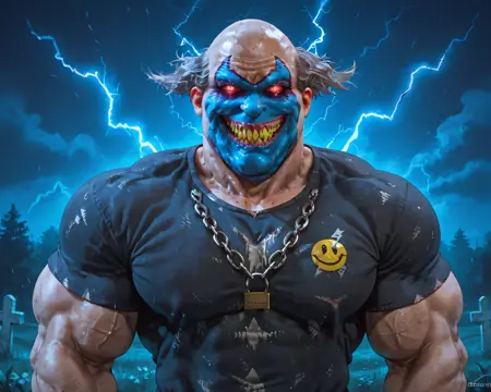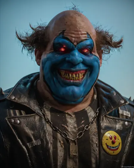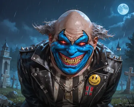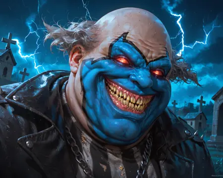 | トレーニングワード | Vio_lat2or_clo1w3nコピーしました! blue and light blue print on the face with black trim, pale skin, low and fat, short clown,casually painted face, bald spot on head, grey hair on sides, blue face paint, red eyes, yellow teeth, sharp teeth,jagged teeth, demonic clown, wearing a dark leather jacket,コピーしました! |