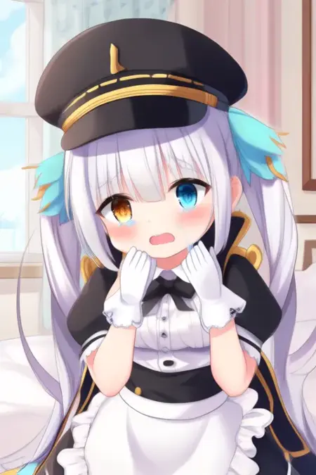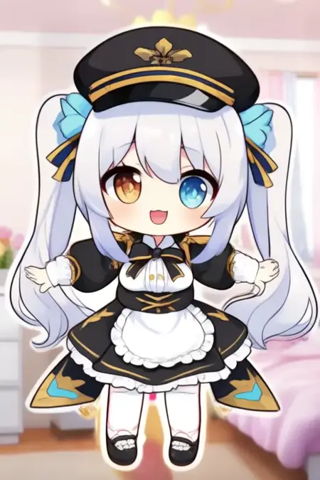 sample prompt:Kagura Mea, anime-style girl. The image features an anime-style character with long white hair styled in two braids. The character has one blue eye and one brown eye, giving them a distinctive appearance. They are wearing a black and white uniform with gold accents, including a black hat with a gold trim and a white scarf tied around their neck. The character is also wearing white gloves and has a cheerful expression on their face.The outfit includes a black bow tie and a white lace trim on the sleeves and skirt. (she is dancing:2.5), (chibi Nendoroid:3.5) in bedroom.