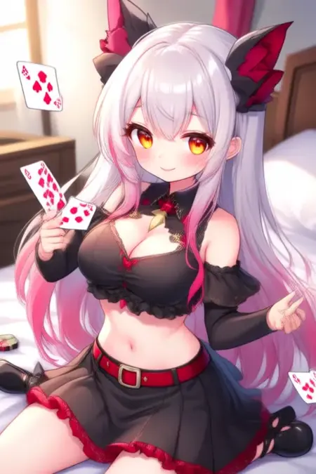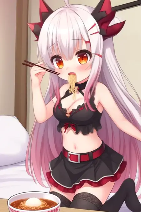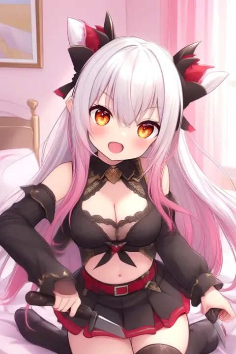 サンプルプロンプト: Suou Patra, anime-style girl. The image features an anime-style character with long, flowing white hair that has pink highlights. The hair is styled in loose waves, cascading down past the shoulders. The character has large, expressive orange eyes that convey a sense of excitement or joy. The character is wearing a black outfit with red accents. The top is a crop top with a lace-up front, revealing a small amount of midriff. The skirt is a short, pleated skirt with a red trim around the hem. The character also wears black shoes with red bows on the heels. A red belt with silver buckles cinches the waist. (she is dancing:2.5), (chibi Nendoroid:3.5) in bedroom.