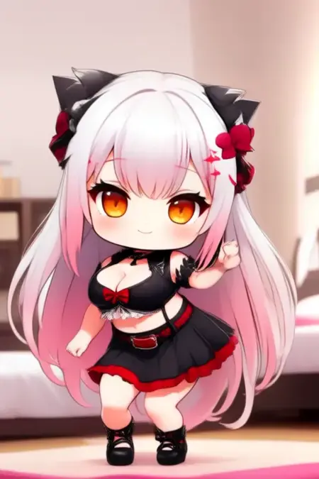 샘플 프롬프트: Suou Patra, 애니메이션 스타일의 소녀. 이미지는 길고 흐르는 흰색 머리카락에 분홍색 하이라이트가 있는 애니메이션 스타일의 캐릭터를 특징으로 합니다. 머리는 느슨한 물결무늬로 길게 어깨 아래까지 흘러내리며, 커다랗고 생동감 있는 주황색 눈을 가지고 있어 흥분이나 기쁨을 전달합니다. 캐릭터는 블랙 옷에 빨간 액센트를 더한 복장을 착용하고 있습니다. 상의는 앞쪽이 끈으로 매듭지어진 크롭 탑으로, 약간의 복부가 드러나 있으며, 치마는 단축된 접힌 치마로 테두리에 빨간 테두리가 있습니다. 캐릭터는 발목에 빨간 과자 매듭이 달린 블랙 신발을 신고 있으며, 허리에는 은색 버클이 달린 빨간 벨트가 졸라매져 있습니다. (그녀가 춤을 추고 있음:2.5), (치비 넌도로이드:3.5) 침실에서.