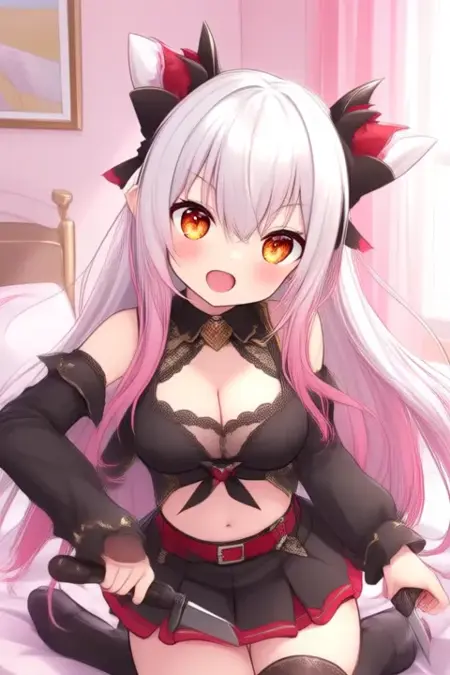 트리거 단어: Suou Patra, 애니메이션 스타일의 소녀. 이미지는 길고 흐르는 흰색 머리카락에 분홍색 하이라이트가 있는 애니메이션 스타일의 캐릭터를 특징으로 합니다. 머리는 느슨한 물결무늬로 길게 어깨 아래까지 흘러내리며, 커다랗고 생동감 있는 주황색 눈을 가지고 있어 흥분이나 기쁨을 전달합니다. 캐릭터는 블랙 옷에 빨간 액센트를 더한 복장을 착용하고 있습니다. 상의는 앞쪽이 끈으로 매듭지어진 크롭 탑으로, 약간의 복부가 드러나 있으며, 치마는 단축된 접힌 치마로 테두리에 빨간 테두리가 있습니다. 캐릭터는 발목에 빨간 과자 매듭이 달린 블랙 신발을 신고 있으며, 허리에는 은색 버클이 달린 빨간 벨트가 졸라매져 있습니다.
