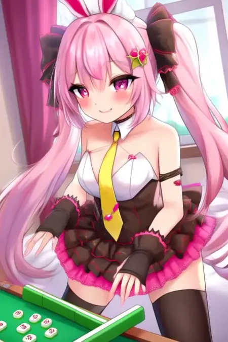 샘플 프롬프트: Tomari Mari, anime-style girl. The image features an anime-style character with long, flowing pink hair that cascades down past the shoulders. The hair is styled in a way that it appears to be tied back, with some strands falling over the shoulders. The character has large, expressive eyes with a mix of pink and black, adding to their vibrant and lively look. The character is wearing a unique outfit that includes a white top with a yellow tie and a brown skirt with ruffles. The skirt has a frilled hem and is adorned with small decorative elements. The character also wears thigh-high boots that match the skirt's color scheme. The character also wears black gloves with pink frills and has a pair of bunny ears on their head, adding to the playful and whimsical nature of the outfit. They are also wearing black shorts with red and black trim. (she is dancing:2.5), (chibi Nendoroid:3.5) in bedroom.