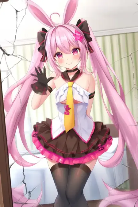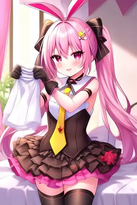 触发词:Tomari Mari,动漫风格女孩。图像展现了一位动漫风格的角色,拥有长而飘逸的粉色长发,垂落至肩部以下。发型看起来像是被束起,部分发丝自然垂落在肩头。角色拥有大而富有表现力的眼睛,融合了粉色与黑色,增添了生动活泼的视觉效果。角色身穿一套独特的服装,包括一件白色上衣、黄色领结和一条带有荷叶边的棕色裙子。裙子下摆呈褶皱状,并点缀着小巧的装饰元素。角色还穿着与裙子配色一致的过膝长靴。此外,角色佩戴黑色手套,手套上饰有粉色褶边,头上戴着一对兔耳,进一步强化了服装的活泼与梦幻感。她还穿着一条黑色短裤,边缘饰有红色和黑色条纹。