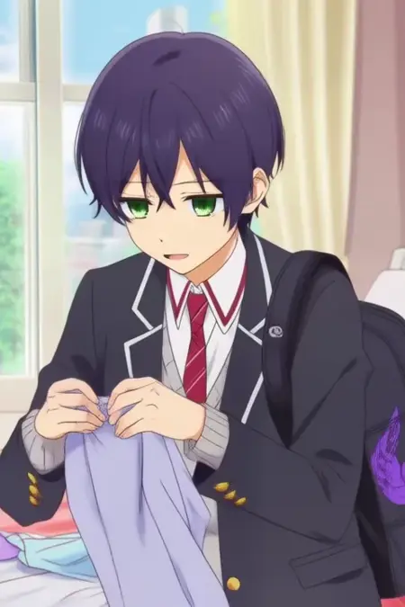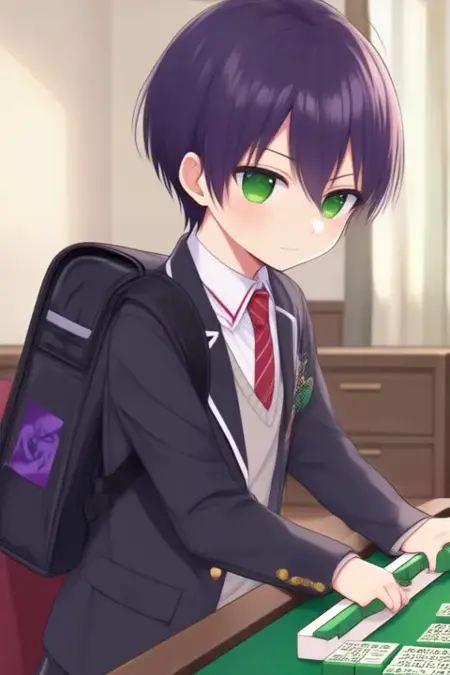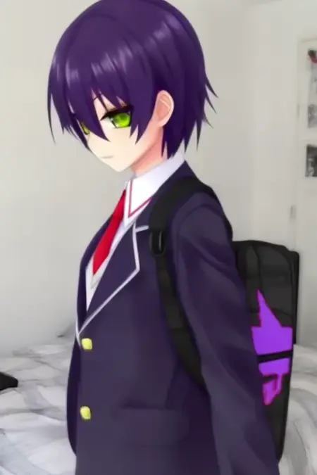 트리거 단어: Kenmochi Toya, 애니메이션 스타일 소년. 이미지는 짧고 어두운 보라색 머리카락을 캐주얼하게 스타일링한 캐릭터를 특징으로 합니다. 캐릭터는 녹색 눈을 가지고 있으며, 흰 셔츠, 빨간 넥타이, 금색 단추가 달린 어두운 블레이저로 구성된 교복을 입고 있습니다. 캐릭터는 보라색 무늬가 있는 검은 백팩도 들고 있습니다.