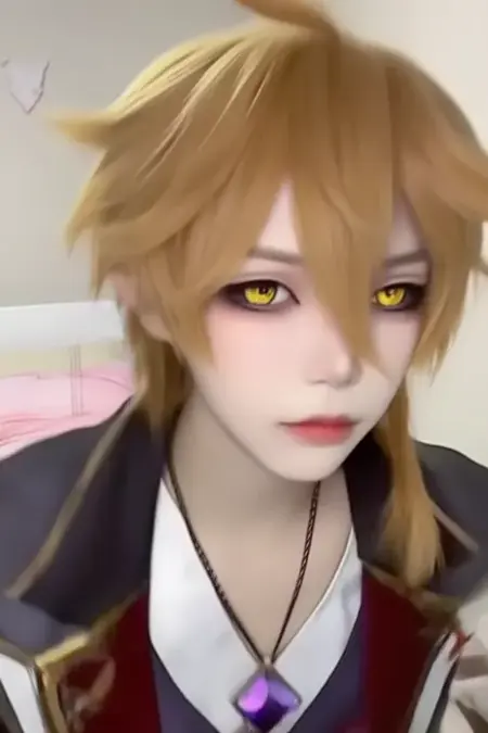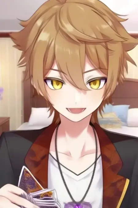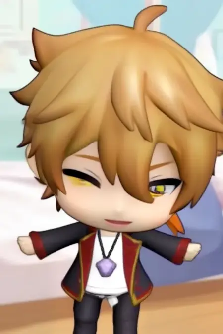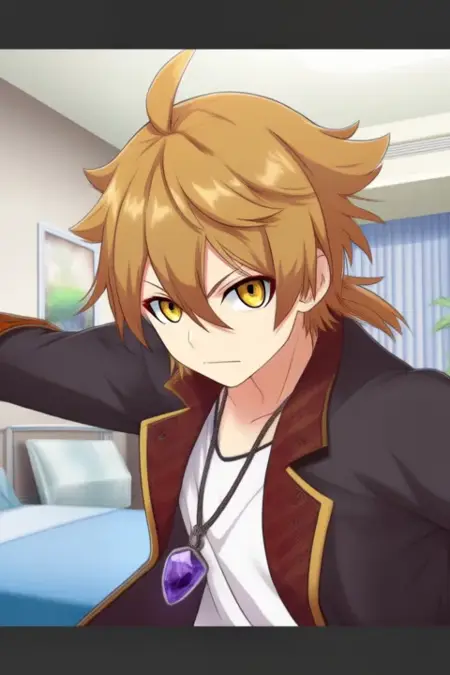샘플 프롬프트: Fushimi Gaku, anime-style boy. The image features a character with light brown hair styled in a messy, spiky manner. The hair appears to be slightly tousled, giving it a dynamic look. The character has striking yellow eyes that stand out prominently against their skin tone. The character is wearing a traditional outfit, which includes a dark-colored jacket over a white shirt. The jacket has a high collar and a patterned design on the front. Around the neck, there is a necklace with a purple gemstone pendant, adding a touch of elegance to the attire. (she is dancing:2.5), (chibi Nendoroid:3.5) in bedroom.