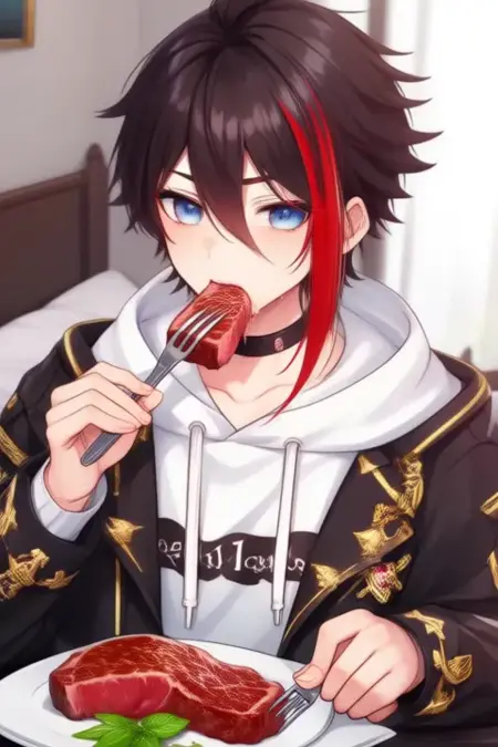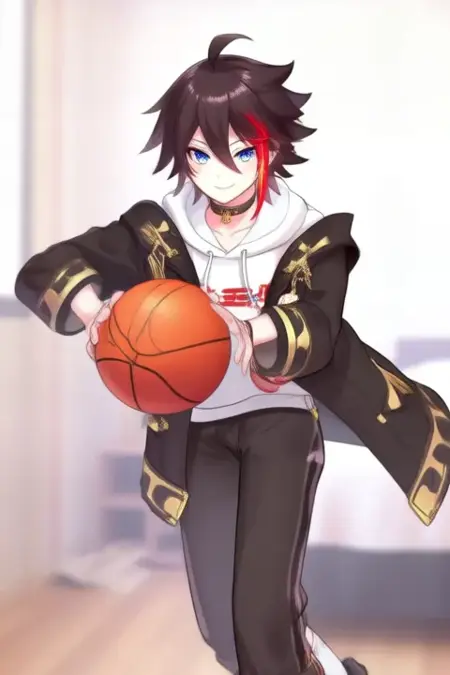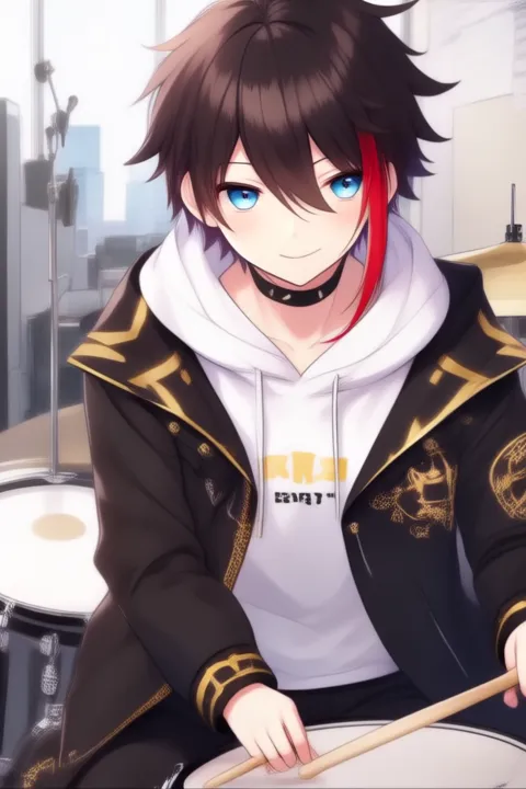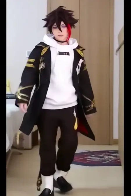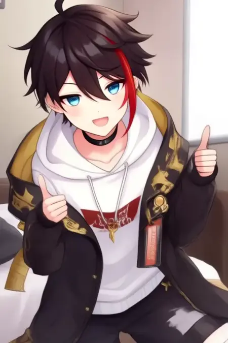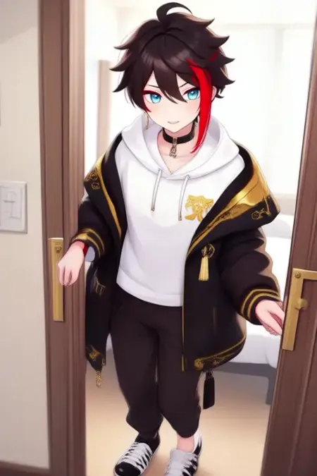 sample prompt:Saegusa Akina, anime-style boy. The image features an anime-style character with dark brown hair styled in a messy, slightly tousled manner. The character has a single streak of bright red hair on the right side of their face, which contrasts with the rest of their dark hair. Their eyes are a striking blue, adding to their expressive appearance.The character is wearing a white hoodie with a high collar,and gold accents on the shoulders, which is open at the front. The hoodie has a black choker around the neck and a small tag on the left side that reads "221B".The character is wearing a black jacket with gold accents, including a white collar and cuffs.The hoodie is paired with dark pants that have a relaxed fit, and they are also wearing white socks and black shoes. (she is dancing:2.5), (chibi Nendoroid:3.5) in bedroom.