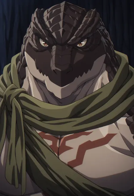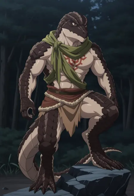 触发词(zaryusu shasha): zaryusu shasha, 人形, 爬虫人, 棕色眼睛, 棕色鳞片, 胸部纹身, 绿色围巾, 裙裤, 足趾行走
