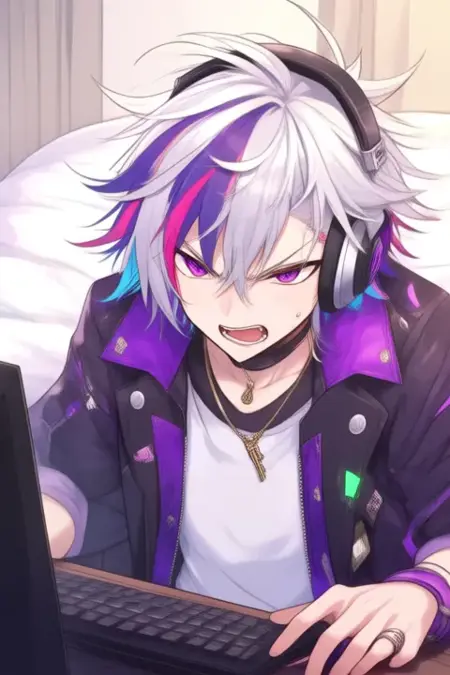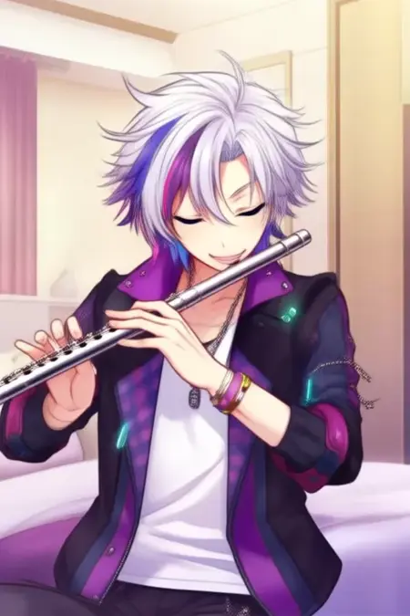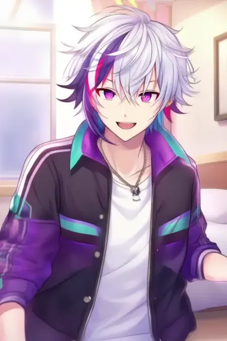 触发词2:Fuwa Minato,动漫风格男孩。图像呈现一位具有独特发型的动漫风格角色,头发主要为白色,带有紫色和蓝色的发丝,凌乱而蓬松地披落在肩部。角色拥有醒目的紫色眼睛,身穿一件深紫与浅紫相间的夹克,带有绿色点缀,夹克有多颗纽扣,内搭白色衬衫,并佩戴一条带有吊坠的项链。