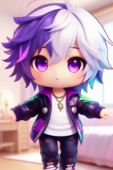 示例提示:Fuwa Minato,动漫风格男孩。图像呈现一位具有独特发型的动漫风格角色,头发主要为白色,带有紫色和蓝色的发丝,凌乱而蓬松地披落在肩部。角色拥有醒目的紫色眼睛。服装为深色高领西装外套,内搭同色系衬衫,身穿深紫色西装,配以领结。西装配有金色纽扣和胸针。(她正在跳舞:2.5),(Q版nendoroid:3.5)在卧室中。
