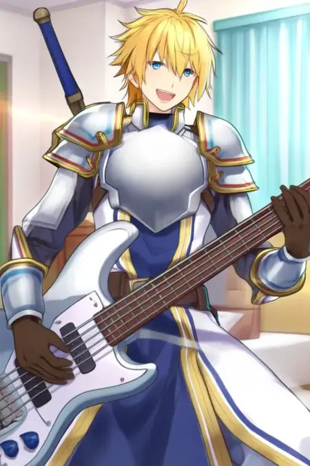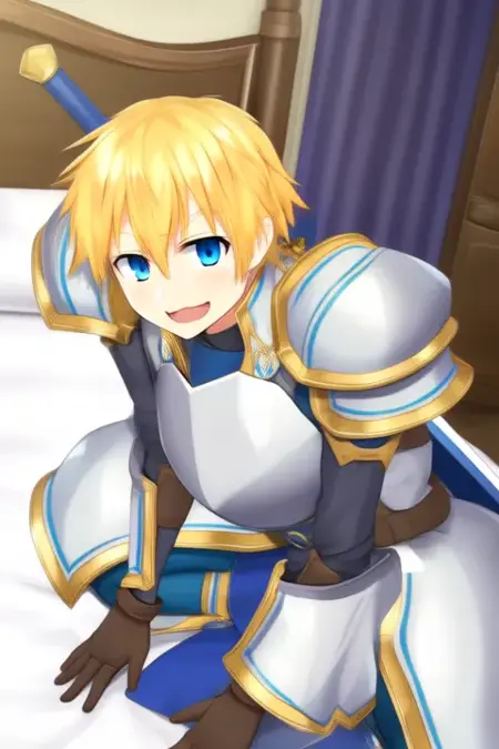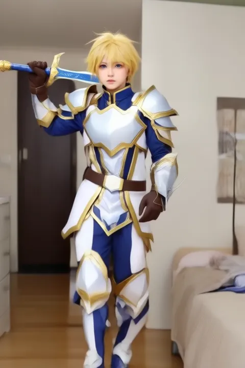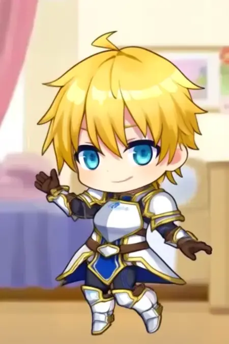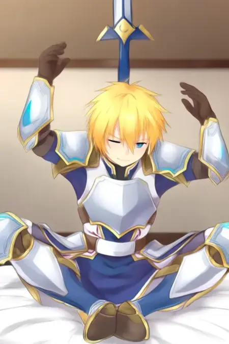 サンプルプロンプト:Ex Albio、アニメスタイルの少年。画像は、不整で尖った金色の髪をしたアニメスタイルのキャラクターを描写しています。キャラクターは青い目をしており、白とゴールドのアーマーに青いアクセントが施されています。アーマーには肩当て、腕当て、胸板、ガントレット、脚当てが含まれます。キャラクターは右手に剣を持ち、それを頭上に掲げています。両手には茶色の手袋を着用しています。 (she is dancing:2.5), (chibi Nendoroid:3.5) in bedroom.