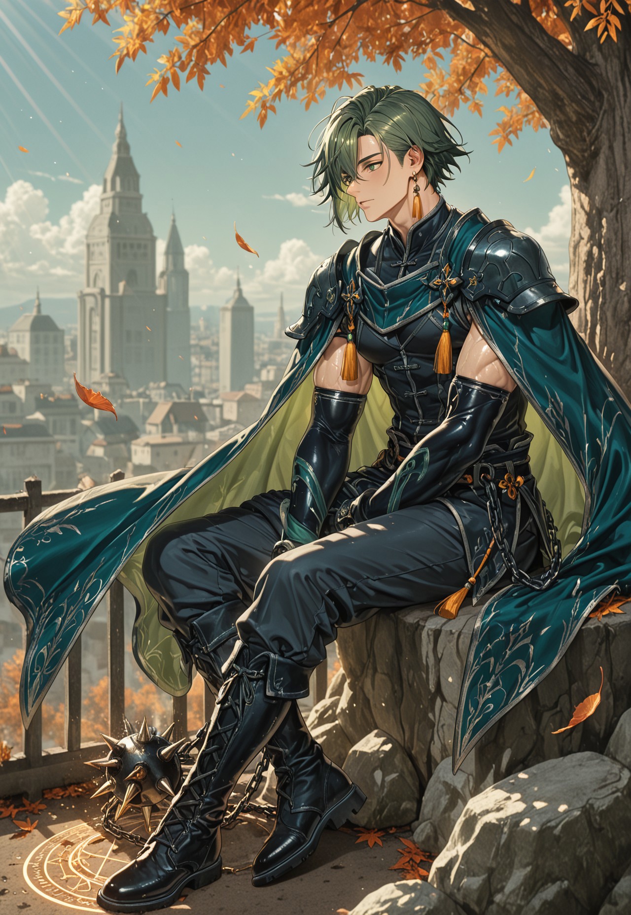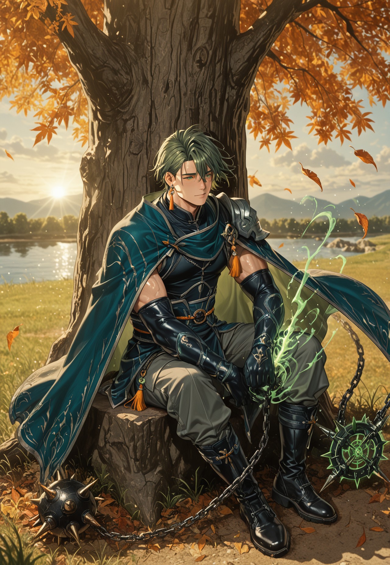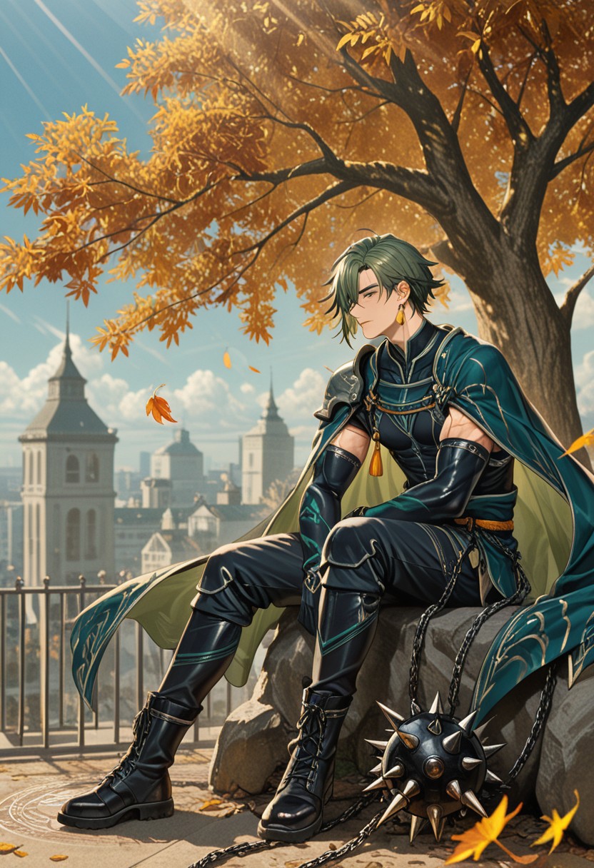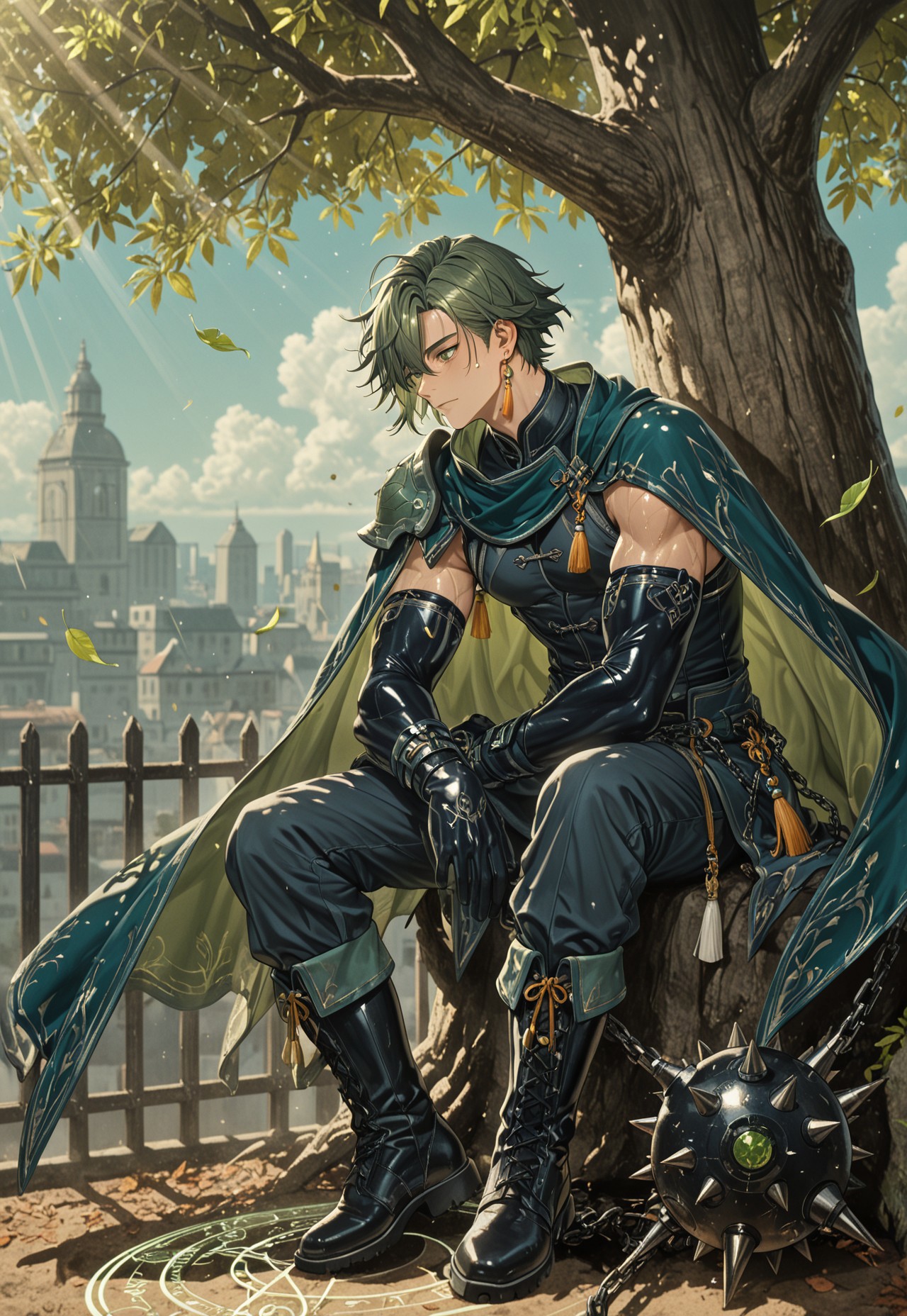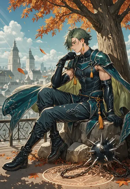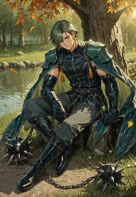 cape, pauldrons, elbow gloves, tassel, pants, boots, ball and chain (weapon),