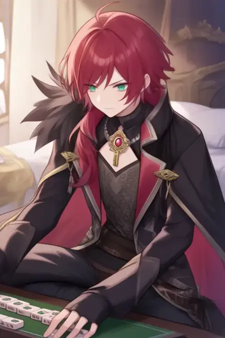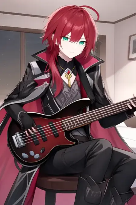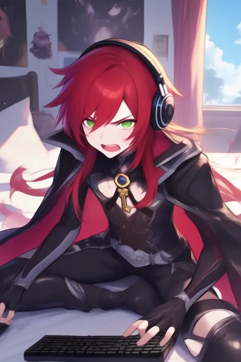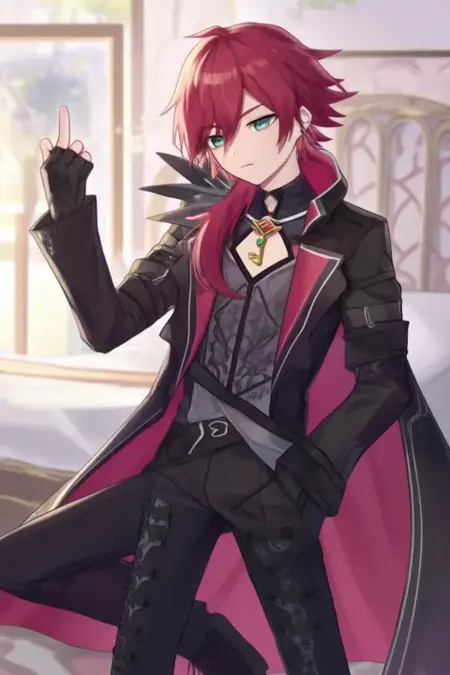 Trigger Word:Lauren Iroas, anime-style boy. The image features a character with long, flowing red hair that cascades down to their shoulders. The hair is styled in loose waves, giving it a slightly tousled appearance. The character has striking green eyes that stand out against the vibrant red of their hair.The character's clothing is detailed and elaborate, featuring a mix of dark and light colors. They are wearing a black and white outfit with intricate designs, including a high collar and a cape that drapes over one shoulder. The outfit also includes a key pendant hanging from their chest, adding a touch of elegance and mystery to their appearance.The character also wears black pants that fit snugly, complementing the overall dark theme of the attire. The outfit is completed with black boots that have a glossy finish, adding to the character's imposing presence.