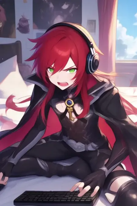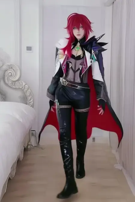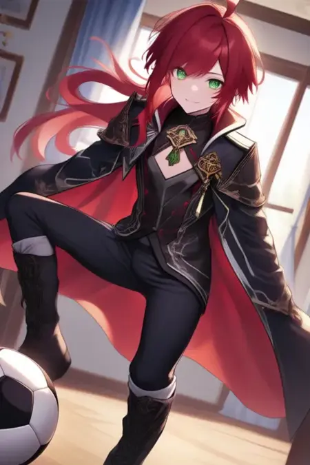 触发词:Lauren Iroas,动漫风格男孩。图像中的角色拥有一头长而飘逸的红色长发,垂至肩膀。头发呈松散波浪状,略显凌乱。角色拥有醒目的绿色眼睛,在鲜亮的红发映衬下格外突出。角色的服装细节丰富且精致,融合了深色与浅色元素,身穿黑白相间的服饰,配有复杂图案,包括高领和垂落在一侧肩膀的斗篷。服饰胸前还悬挂着一把钥匙吊坠,增添了优雅与神秘感。角色还穿着贴身的黑色长裤,与整体深色装扮相得益彰。脚踩一双亮面黑色靴子,进一步强化了角色的威严气场。