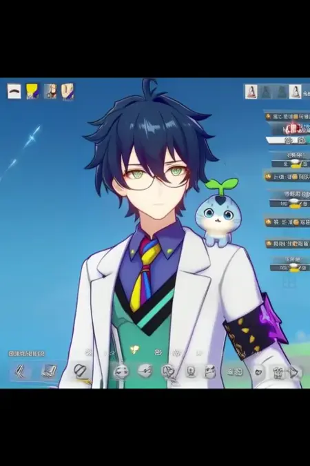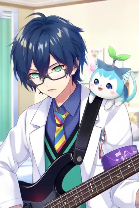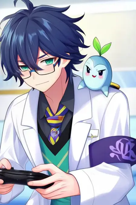 Trigger Word:Leos Vincent, anime-style boy. The image features an anime-style character with dark blue hair styled in a messy, spiky manner. The character has green eyes and is wearing glasses with a thin frame. They are dressed in a white lab coat over a blue shirt with a colorful tie featuring yellow, red, and blue stripes. The character's sleeves are rolled up to the elbows, revealing a green undershirt. The character is also wearing a black armband with a purple design on their left arm.The lab coat has a green and black design on the chest area, adding to the character's unique and stylish look. In the character's hand, there is a small, cute creature resembling a cat or a small animal with a light blue body and a green leaf sprouting from its head. The creature appears to be perched on the character's shoulder,