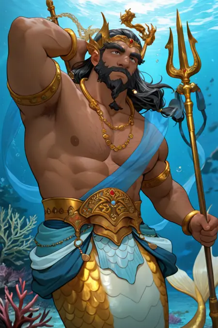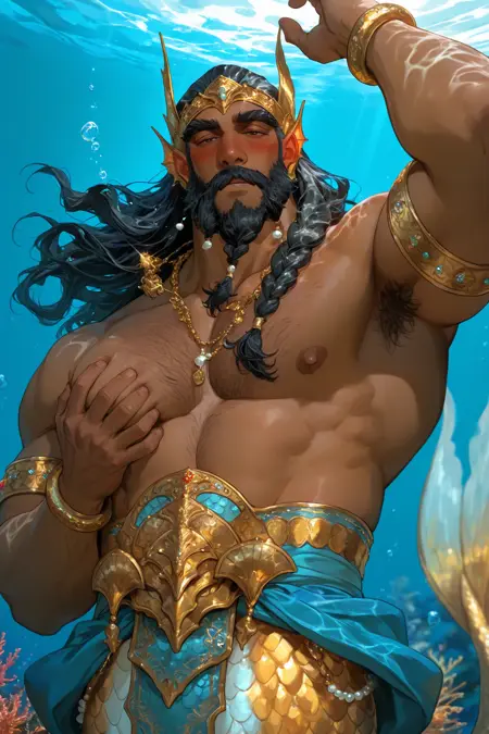 merman, gold scales, white scales, beard ornaments, crown, armlet, gold bracelets, gold dragon necklace, pearl jewelry, ornamental gold belt, blue sash,