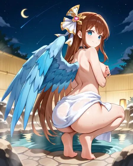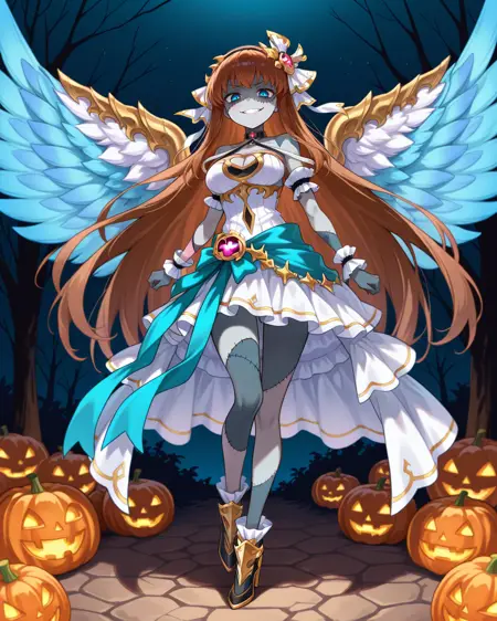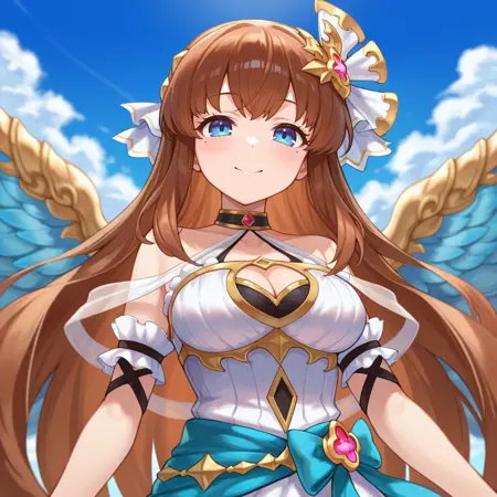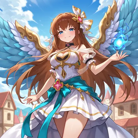 천상의 날개 라라: l4r4alt, 1girl, 긴 머리, 갈색 머리, 파란 눈, 파란 날개, 머리 장식, 머리 리본, 목걸이 보석, 흰 드레스, 가슴 절개, 팔밴드, 청록색 허리띠, 흰 아웃스커트, 하이힐