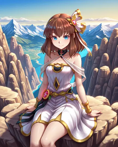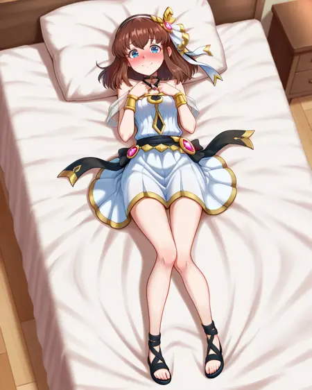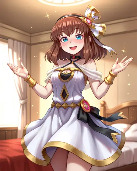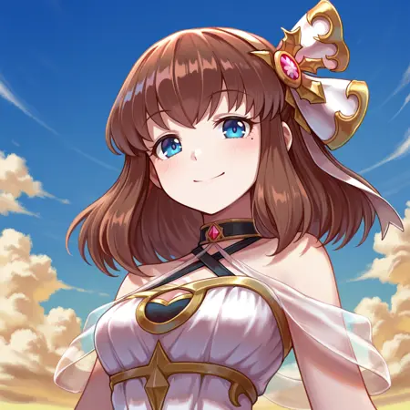 성스러운 라라: l4r4def, 1girl, 중간 길이 머리, 갈색 머리, 파란 눈, 머리 장식, 검은 목걸이, 흰 드레스, 중간 길이 드레스, 팔보호대, 검은 샌들