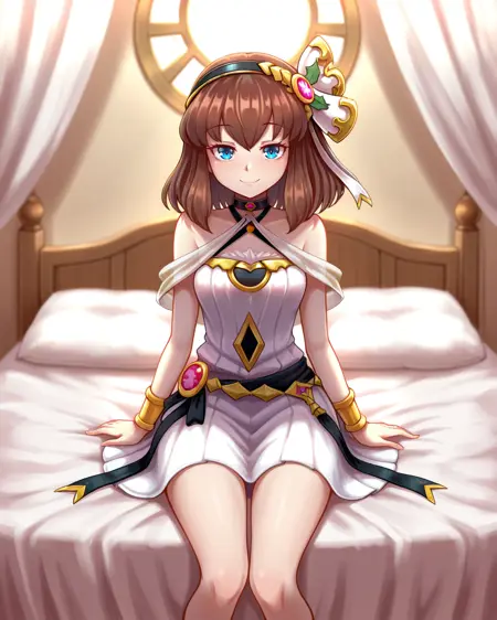 Sacred Lara: l4r4def, 1girl, medium hair, brown hair, blue eyes, hair ornament, black choker, white dress, medium dress, bracer, black sandals
