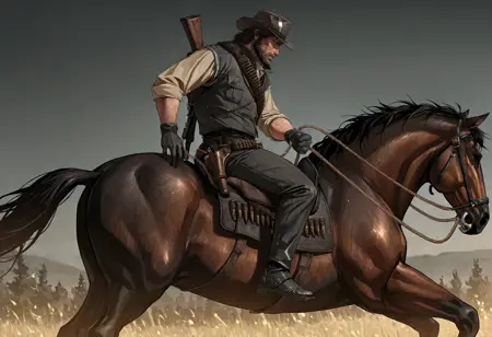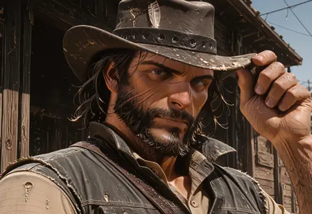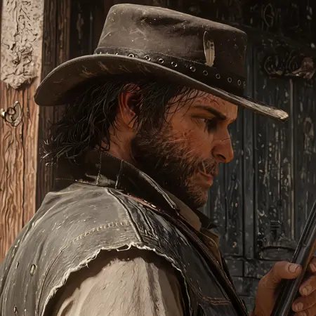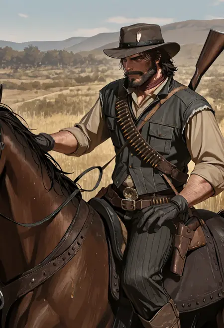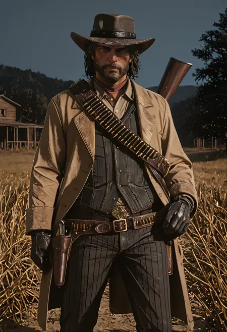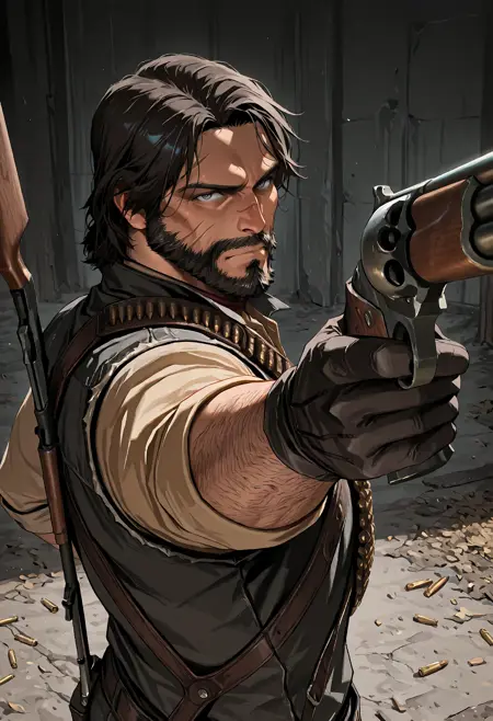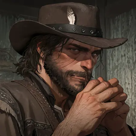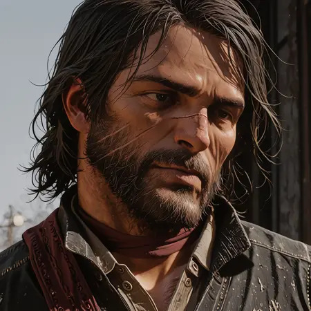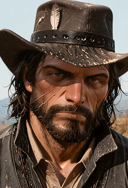 rdr1j0hnmarston, 成熟男性, 未经打理的中等深棕色头发, 深灰色眼睛, 乱糟糟的胡须, 右脸颊有疤痕