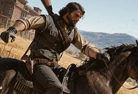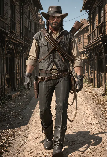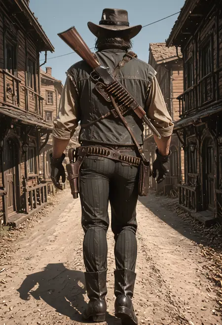 深灰色带羽毛的牛仔帽,深灰色无袖牛仔背心,米色衬衫,红色围巾,黑色手套,深色条纹长裤,黑色靴子,金色扣带,枪套腰带,弹药背带,肩挎包,背后背步枪