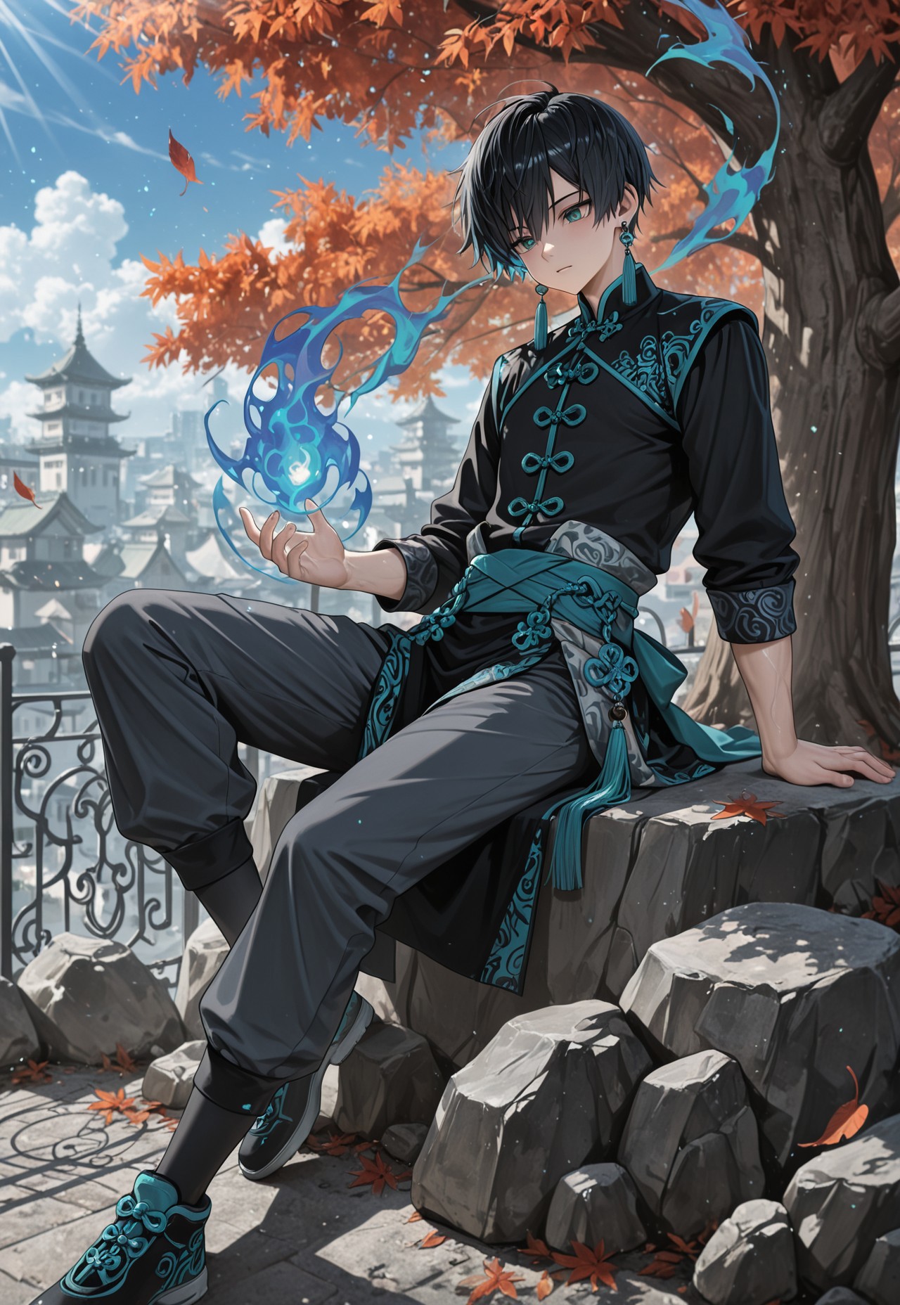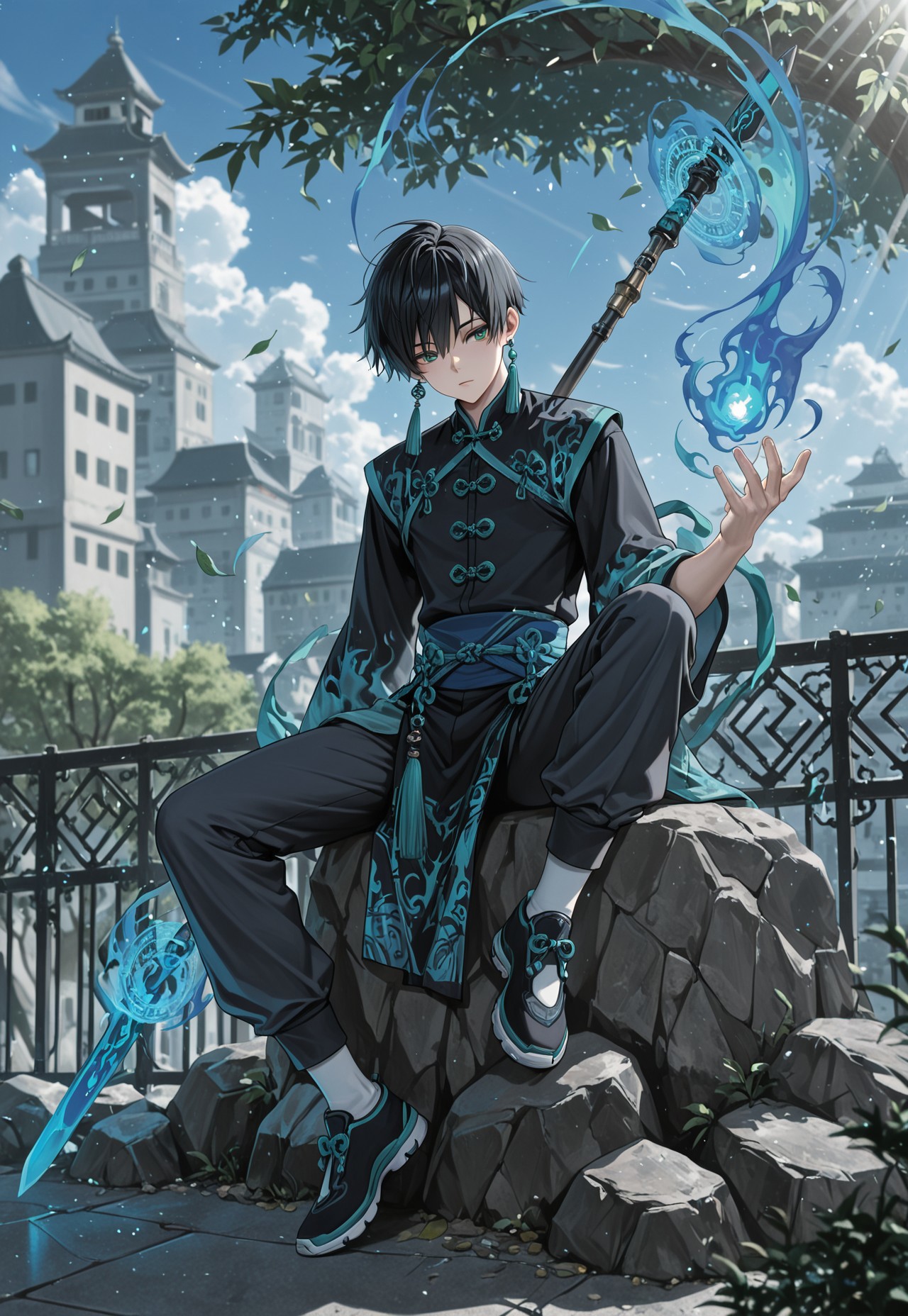 zhu_black hair, zhu_green eyes,