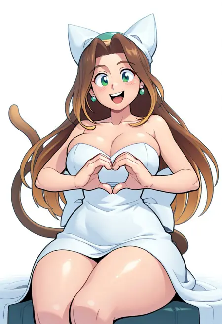 Sara, brown hair, green eyes, strapless white dress, giant white bow on back, white hat, earrings, cat tail