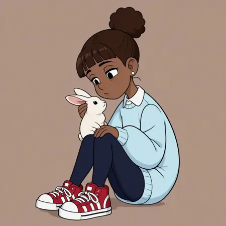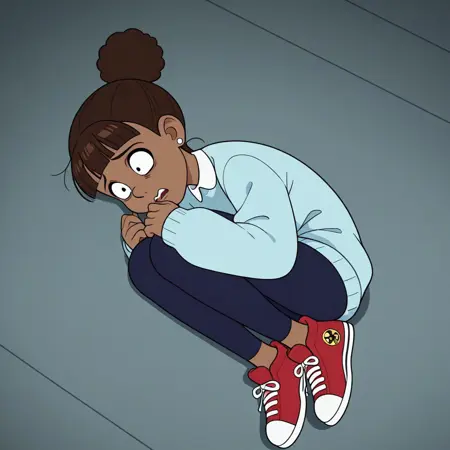 Marsha, 1girl, solo, Dark skin, dark brown hair in a high bun, straight bangs, earrings, light blue sweater with a white collar, dark blue leggings, red ballerina shoes