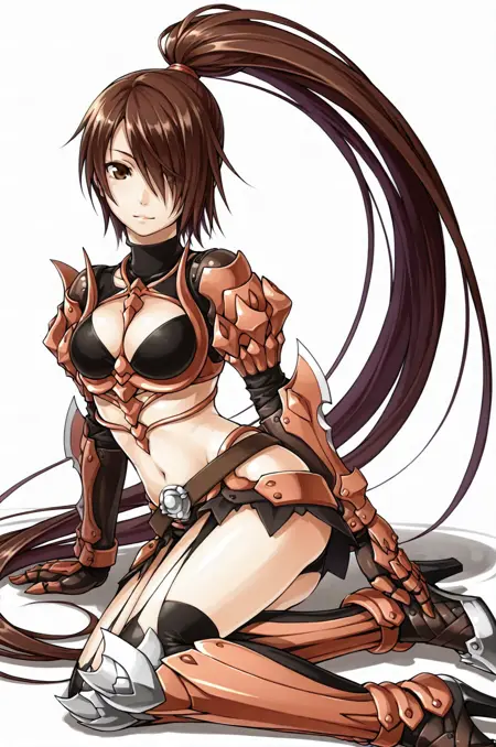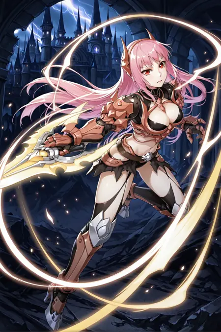 prompt: gcross, 比基尼盔甲,露腹,护腕,内衣,肩甲,服装镂空,高领,胸脯镂空,肚脐,腰带,过膝长筒袜,高跟鞋,装甲靴