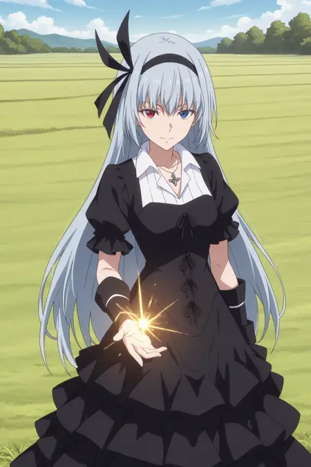 aaluminous, heterochromia, red eyes, blue eyes, grey hair, black hairband, hair ribbon, gothic, necklace, white collar, black dress, puffy short sleeves, anime coloring, layered dress, frilled dress, frills,