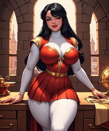 ドレス衣装: long_red_dress, red_pleated_skirt, long_red_skirt, red_bustier, red_bodice, gold_trim, gold_belt, gray_sleeves, gray_turtleneck, gray_collarbone, white_leggings, white_pantyhose,