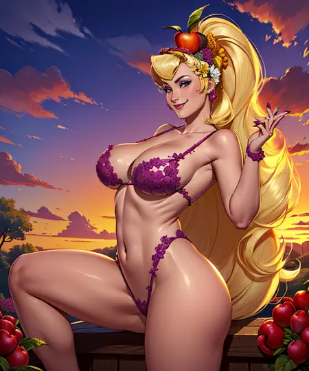Appearance prompt helpers: fruit_headdress, very_long_blonde_hair, makeup, blue_eyes,