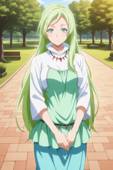 aatreyni, blue eyes, green hair, treynidef, red necklace, multicolored dress, green dress, blue dress, long dress, white sleeves, anime coloring,