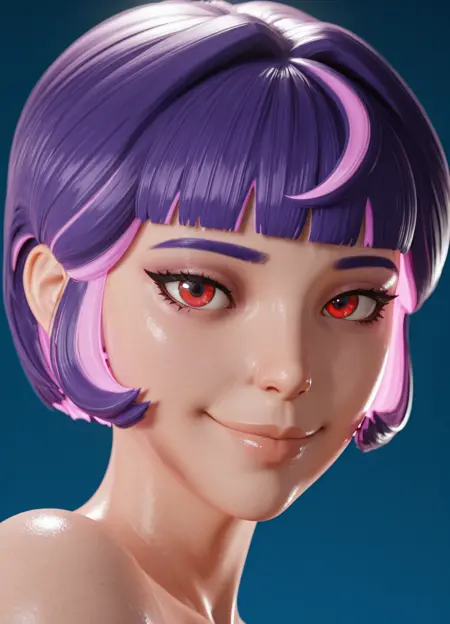 - 紫色头发,挑染头发,短发,黑色眼影,红色眼睛