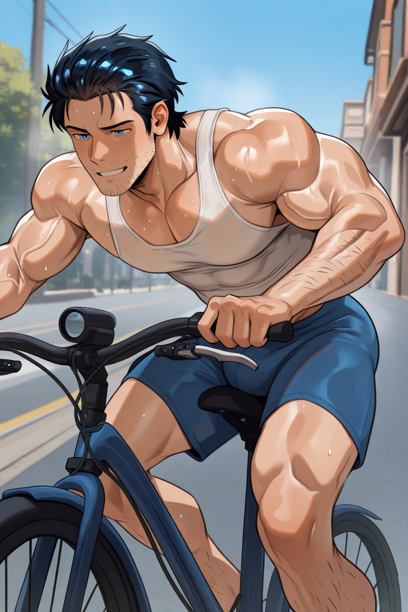 キャラクター: ryusei, 1人の男性、短い黒髪、後ろに流した髪、青い目、やせ型